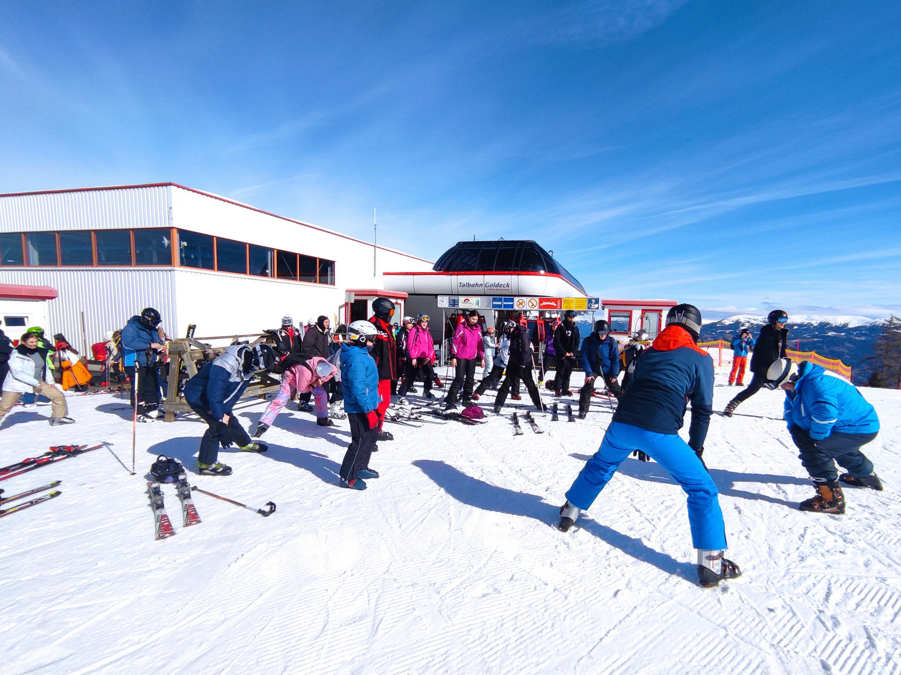 Délben mindenki lecsúszott a felvonóhoz, megmértük és bediktáltuk a cukrunkat, majd beültünk a hüttébe. A közös hüttézések nagyon jók voltak, mert sokat beszélgettünk, finomakat ettünk és majd később csatlakoztunk a csoport többi tagjához, akik a pályán maradtak. A mi csoportunknak lett egy kedvenc pályája, amit elneveztünk Golyópályának. Számtalanszor lecsúsztunk ezen és egymás rekordját döntögettük. Ibi, a csapat vezetője újra és újra megengedte, hogy megjárjuk ezt a pályát. A hosszabb pályáknál bevártuk egymást és a felvonóban is mindig együtt utaztunk. Én nagyon szerettem a felvonói utakat, mert ilyenkor jókat beszélgettünk, nevettünk, viccelődtünk. A pályán, ha valaki elesett, mindig segítettünk a másiknak. A közösen megélt kalandok miatt egy jó társaság alakult ki.