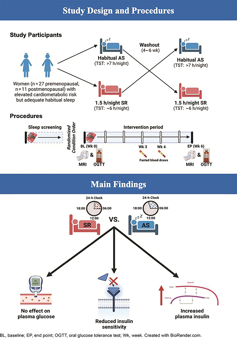 A kutatás során olyan nőket vontak be, akik 20 és 75 év közötti korúak voltak, és nem szenvedtek kardio-metabolikus betegségekben. Ezek a résztvevők rendszerint 7-9 órát aludtak éjszakánként. A tanulmány két 6 hetes fázisból állt: az egyik fázisban a résztvevők elegendő mennyiségű alvást kaptak (adekvát alvás, AS), míg a másikban napi 1,5 órával csökkentették az alvásidőt (alváskorlátozás, SR). A vizsgálatok során a plazma glükóz- és inzulinszinteket, valamint az orális glükóztolerancia-teszt eredményeit elemezték.